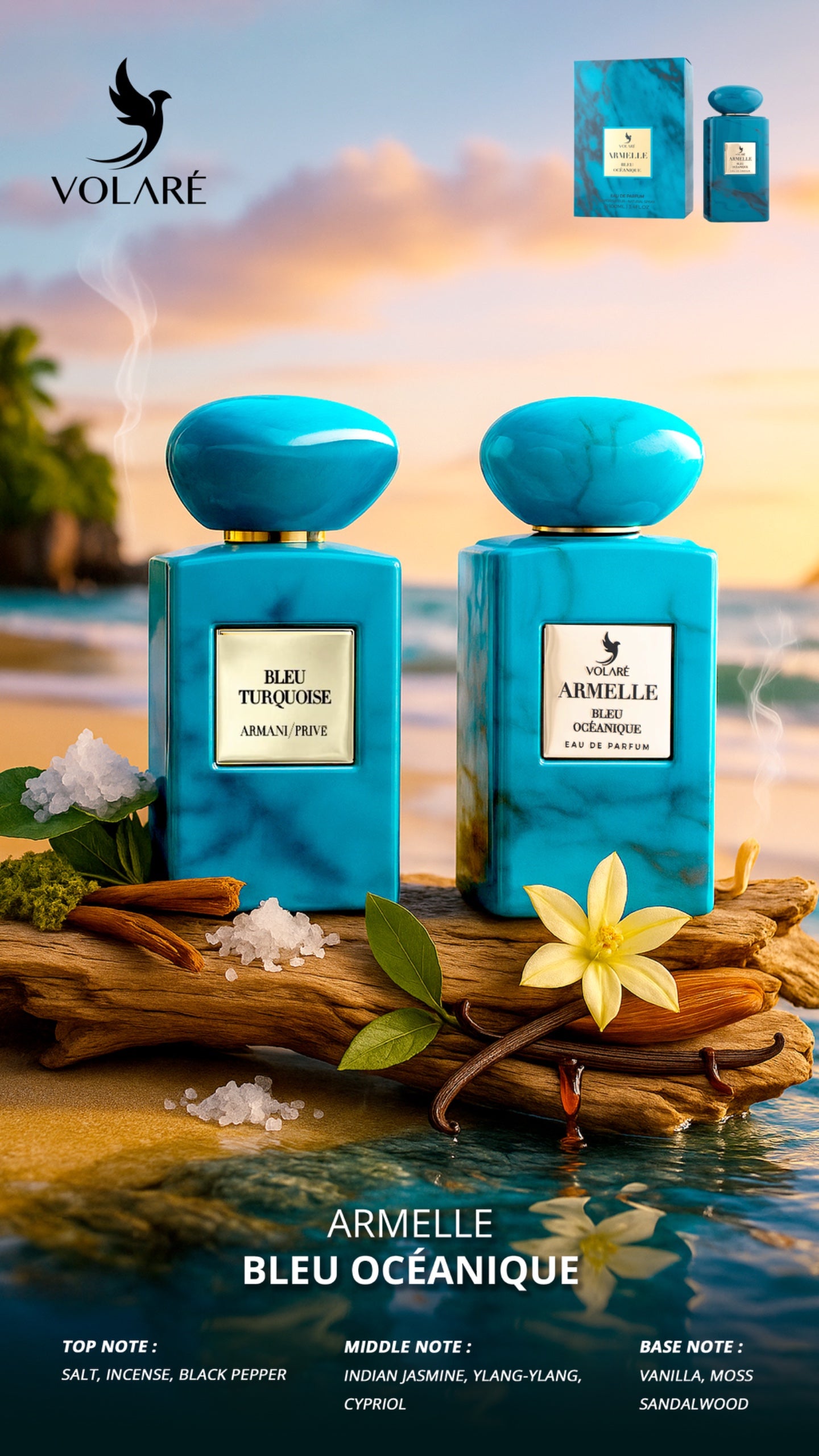 Armelle Bleu Oceanique begins with a mineral spark of incense, sea salt, and black pepper—clean, airy, intriguing. The heart blooms with ylang-ylang, cypriol, and Indian jasmine, adding sun-drenched sensuality. Finally, vanilla and sandalwood settle with a touch of moss into a smooth, addictive trail that lingers from beachside afternoons to late-night plans. 100 ml EDP, made in the UAE.
