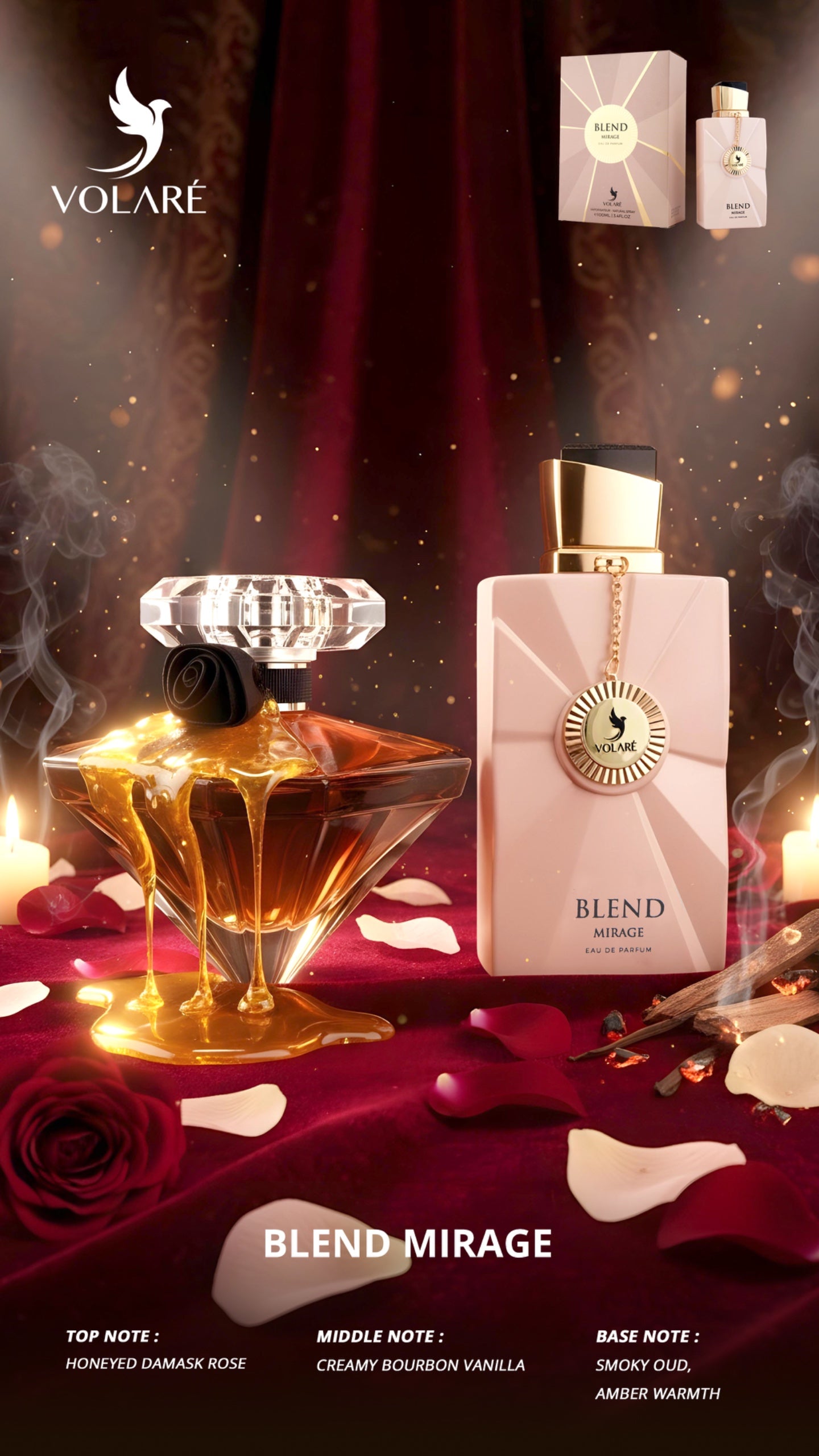 Blend Mirage is a refined blend designed to feel luxurious, confident, and unforgettable. It opens with Black Currant, Pear, evolves into Iris, Jasmine, Orange Blossom, and settles into Praline, Vanilla, Patchouli, Tonka Bean for a polished finish.